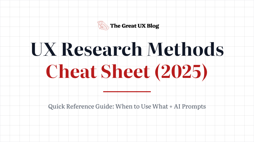 This cheat sheet is what I wish I had when I was starting out: a no-nonsense guide to which research method to use when, plus AI prompts that’ll help you analyze results without spending weeks drowning in data. Whether you’re a solo designer at a startup or part of a UI/UX design agency, this is your practical roadmap.